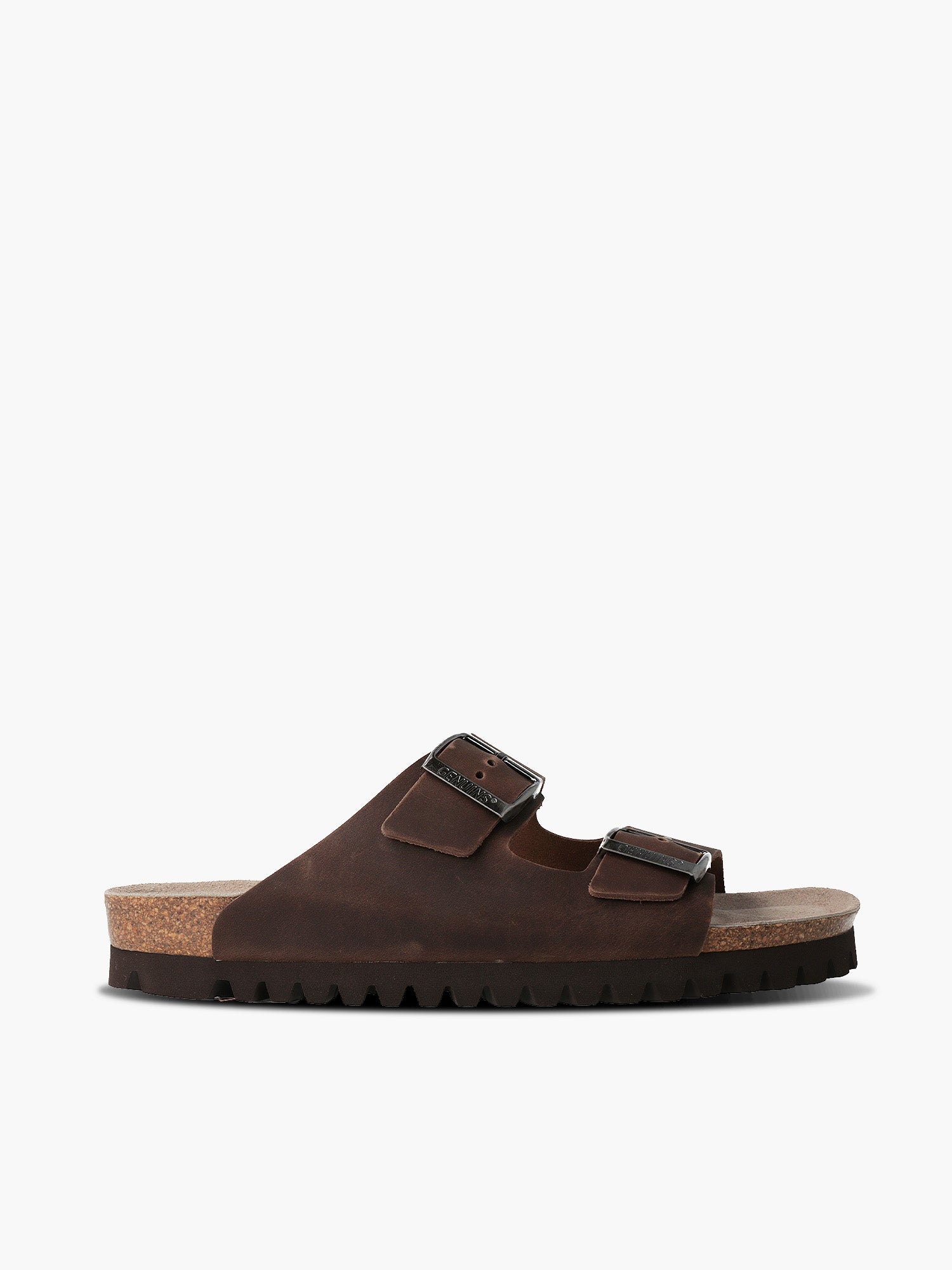 Sandale marron en cuir huilé* avec semelle anatomique et brides à boucles réglables. Cuir certifié par les fournisseurs du Leather Working Group (LWG) avec statut or.